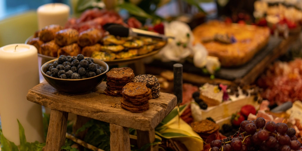 For takeaway options, eco-friendly boxes are a practical choice. When designing whole-table displays, varying height and shape adds interest. Repurpose items like upturned baskets or wooden crates, and consider second-hand shops for unique finds. Adding vases of non-toxic flowers and foliage enhances the visual appeal.