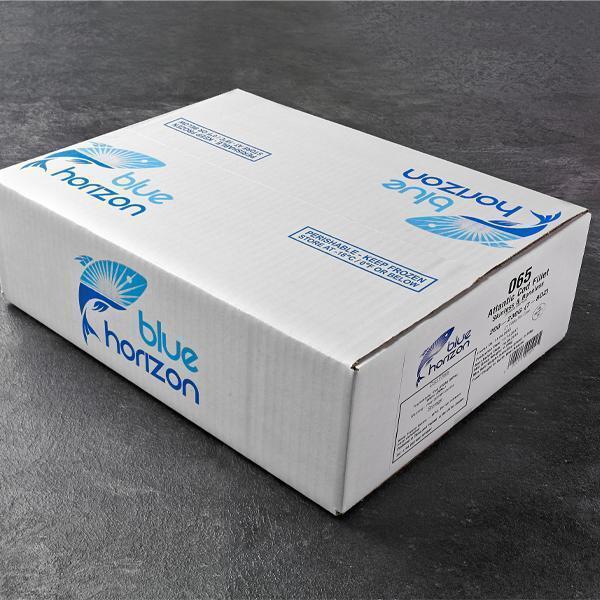 Individually Quick Frozen (IQF) skinless, boneless cod fillets, naturally shaped and free from welded fillets. These fillets are protected with a 20% water glaze, ensuring freshness and quality retention during storage and transport. Each case is labelled and sealed under the Blue Horizon brand.