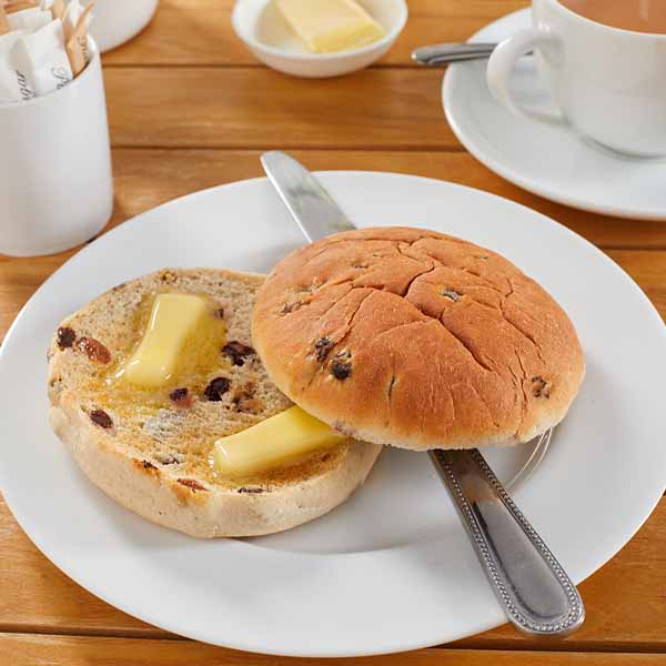 Product Description: A white sweetened bread cake with added currants, sultanas and raisins, with a blend of warm spices and brown sugar.