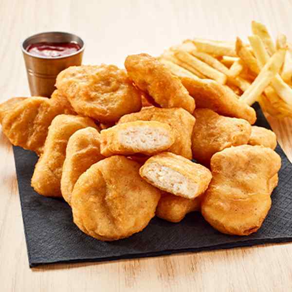 Chopped and shaped chicken nuggets in a crispy batter coating.