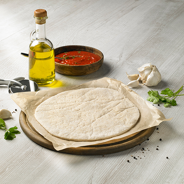 Thin and crispy pizza base made with wheat flour.