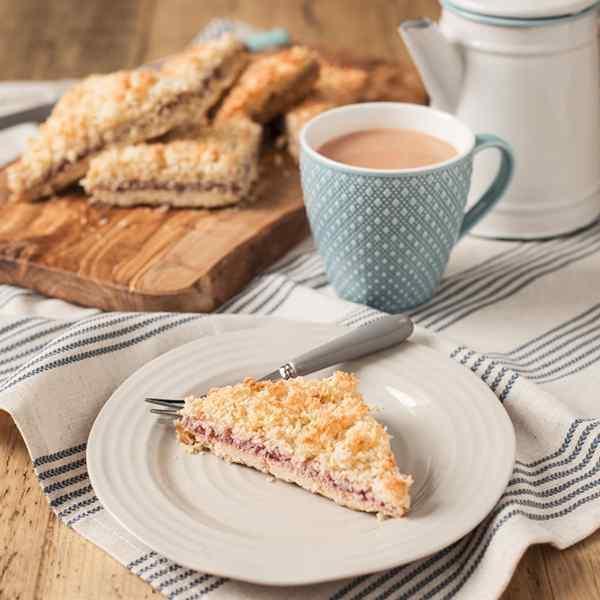 Product Description: A buttery shortbread base layered with a sweet raspberry jam filling finished with a crunchy coconut topping. This traybake is pre-portioned into 12 portions in a multi-portion foil and packed 1 foil per outer.