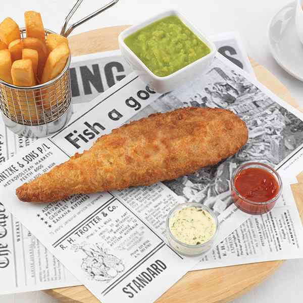 Product Description: Skinned and boned formed cod coated in a light crispy batter.
