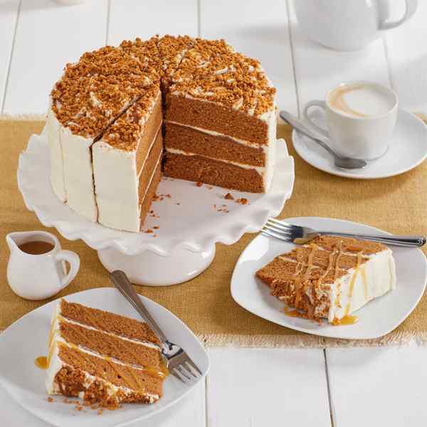 A frozen caramel flavour three layer sponge cake, layered with a speculoos spread and buttercream. Covered with buttercream and finished with a drizzle of speculoos spread and speculoos crumb.