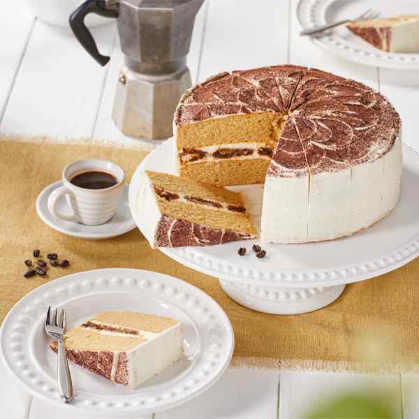 A frozen coffee sponge filled with vanilla buttercream and a layer of coffee soaked sponge finger biscuits with a note of liquor, finished with vanilla buttercream and sprinkled with cocoa powder. This product contains alcohol.