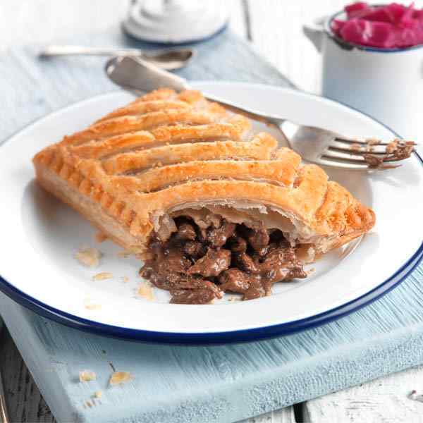 A Machine made puff pastry slice, with HALAL steak in a rich gravy filling. Product is glazed, baked, frozen and distributed.