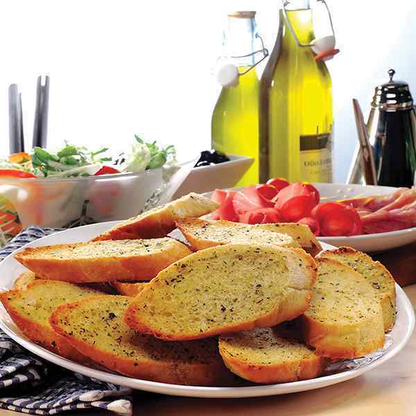 Crusty baguette slices, coated with a margarine-based garlic and parsley topping. The perfect accompaniment to a pasta dish.