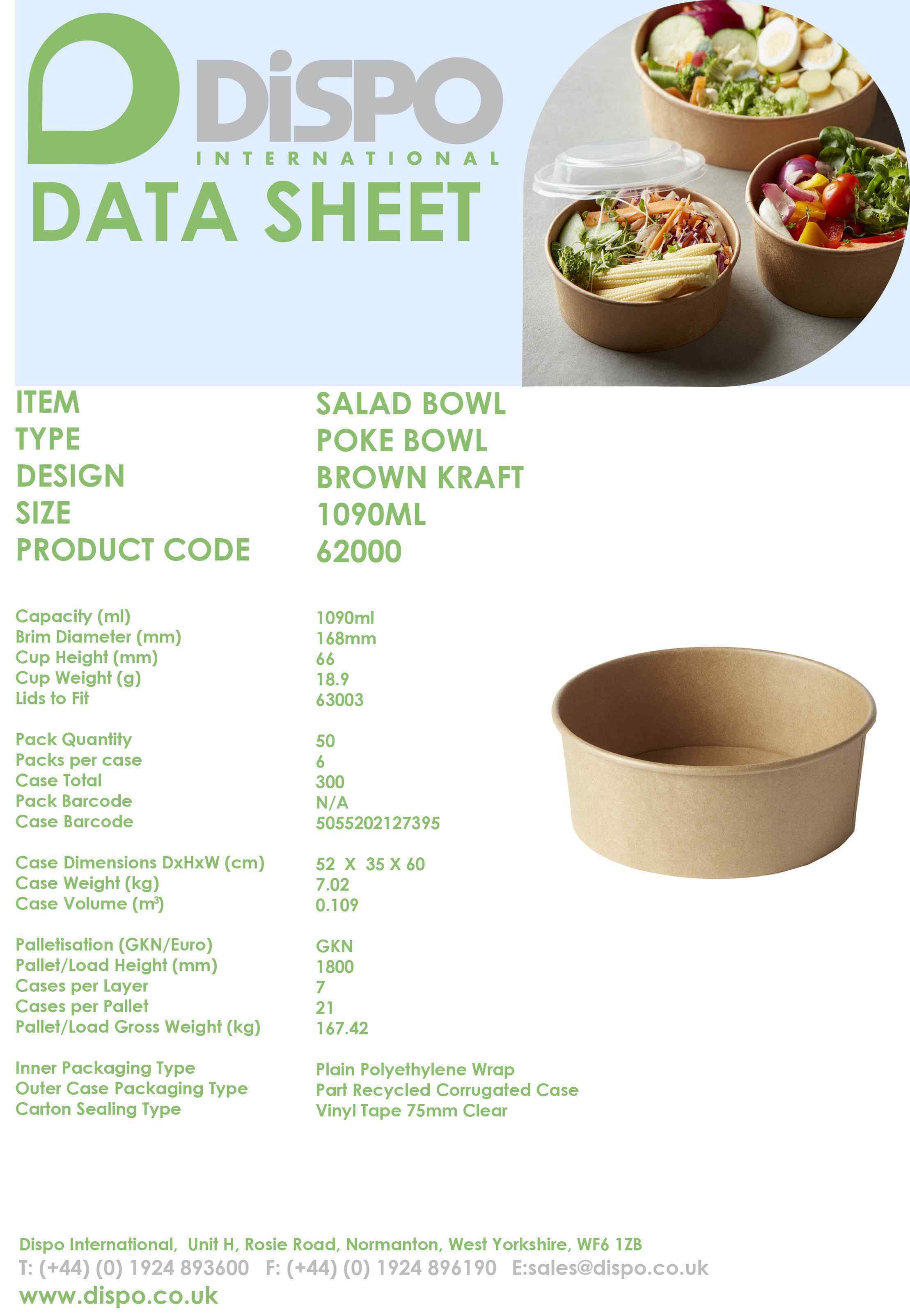 LARGE KRAFT ROUND SALAD BOWLS 6x50 - 1000cc DIAMETER:168MM CODE:62000- 1000ml