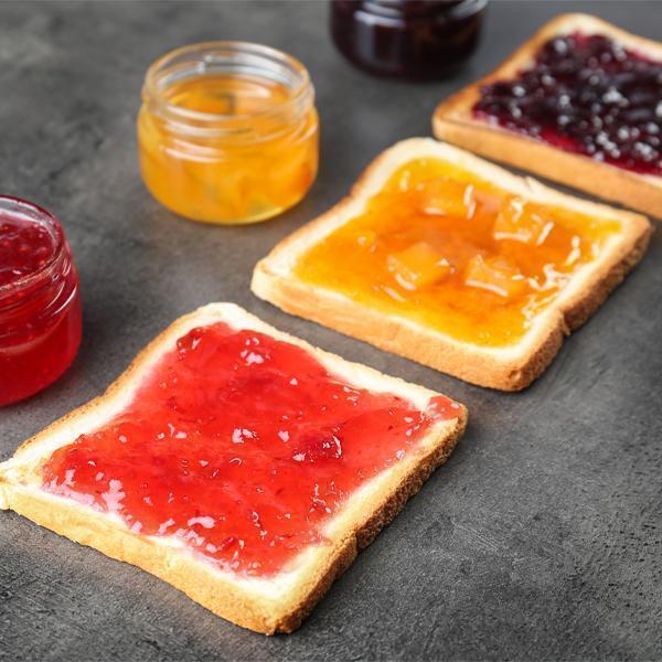 All jams include: Glucose-Fructose Syrup, Fruit (25–35%), Sugar, Pectin (gelling agent), Citric Acid (acidity regulator)