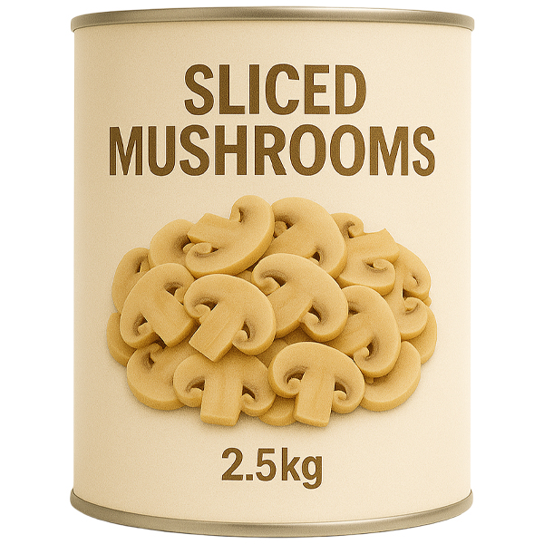 Sliced Mushrooms in salted water 6x2.55kg (net drained weight of 1.2kg per can).