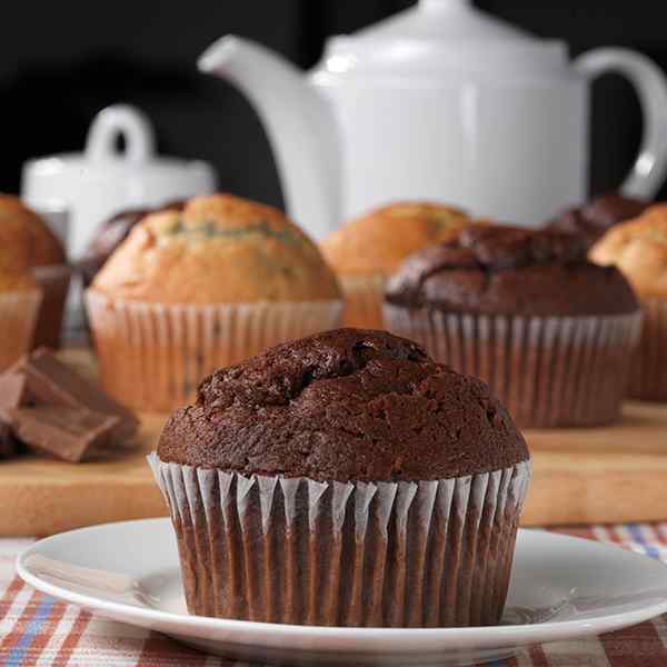 Product Description: A large American style chocolate cake muffin with an even distribution of plain chocolate chunks throughout the crumb.
