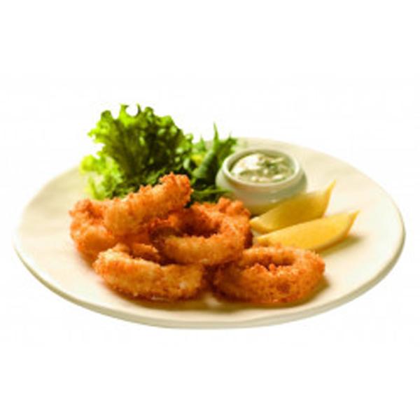 Tenderised Squid rings coated with coarse white Japanese breadcrumb