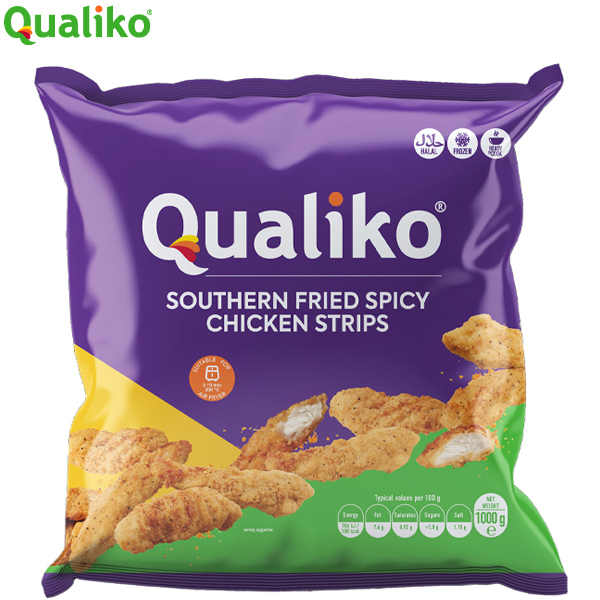 QUALIKO HALAL SF CHICKEN CRISPY STRIPS 1x1kg SOUTHERN FRIED SPICY CHICKEN STRIPS (40-65gm)