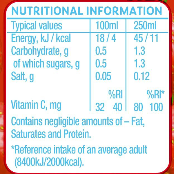 Water, Strawberry Juice from Concentrate (5%), Extracts of (Carrot and Blackcurrant), Acid (Citric Acid), Acidity Regulator (Sodium Gluconate), Thickener (Polydextrose), Vitamin C, Flavourings, Sweeteners (Aspartame, Acesulfame K). Contains a source of Phenylalanine.