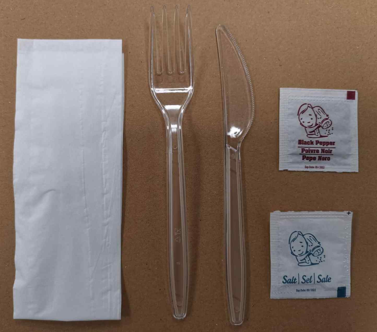 SET 5-1 PL FORK, KNIFE, NAPKIN, SALT & PEPPER PLASTIC MEAL PACK SET 1x250's