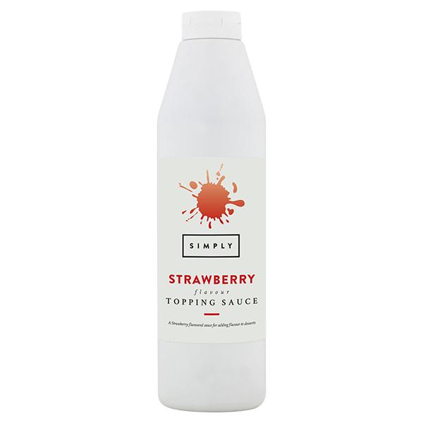 A vibrant red, thick strawberry flavour topping sauce made with 5% strawberry purée, designed for drizzling over desserts, ice cream, waffles, pancakes, milkshakes, and drinks.