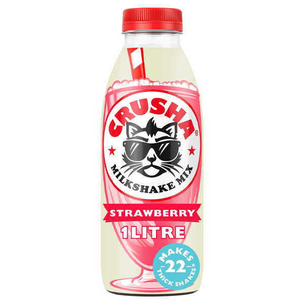 Crusha strawberry flavour milkshake mix with sugar and sweetener.