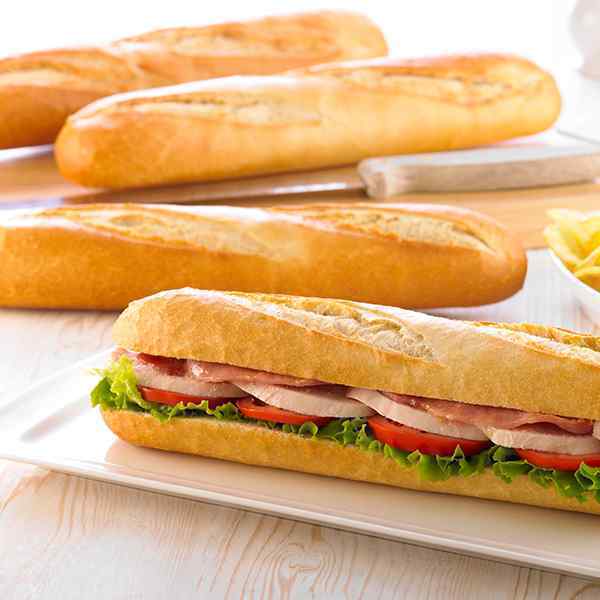 Product Description: A white, ready to serve baguette on average 280mm in length. The product has 3 decorative top cuts and is supplied frozen.